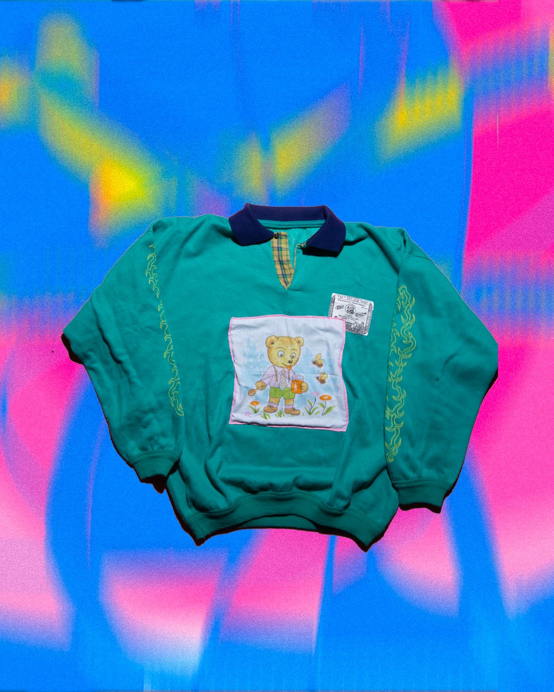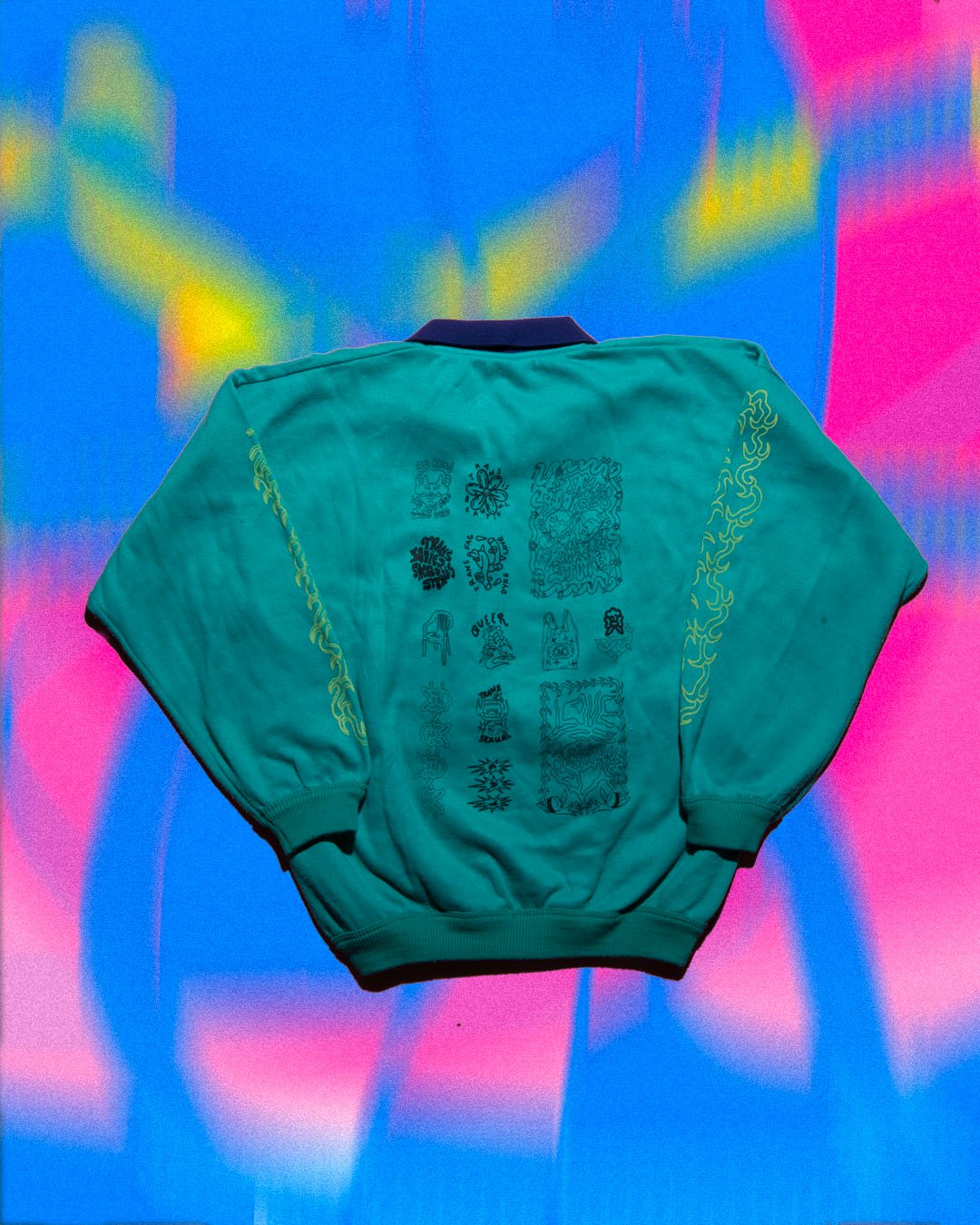 INFO: M / Vintage pullover with collar / Screen printed front, back and both sleeves - by me in my home studio.